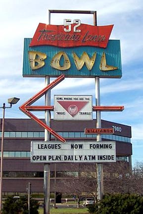 a bowling alley with a terrific mid-century street sign! |