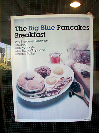 a poster advertising the Big Blue Pancakes Breakfast was on the