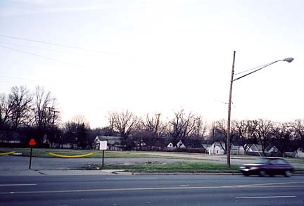 an empty lot, the adjacent service station and rows of post WW